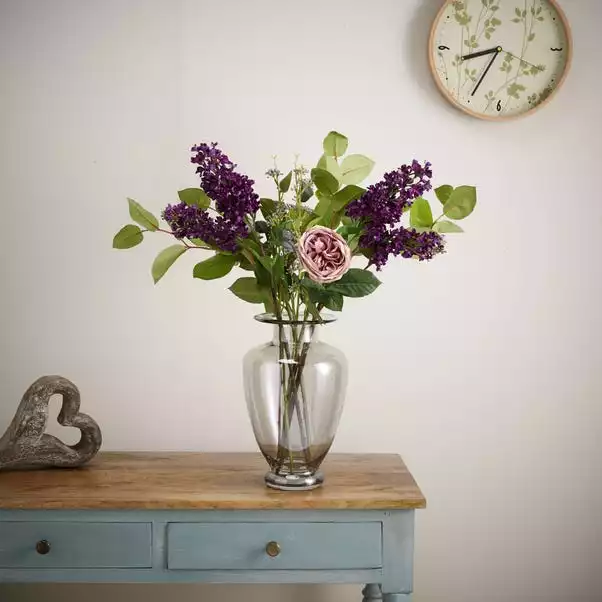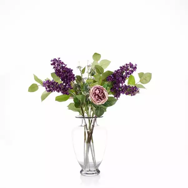 This beautiful mix of lilac and dark purple flowers will complete your room. With realistic flowers and elegant design, this low maintenance arrangement will have your guests talking.