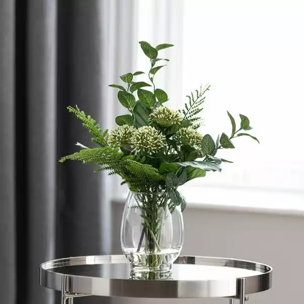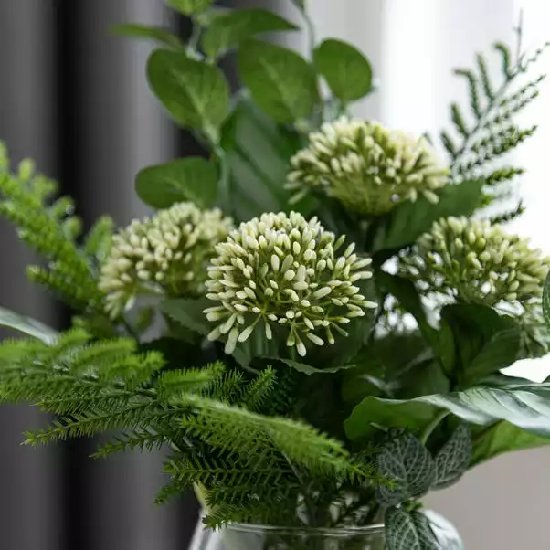This stylish artificial allium and foliage has a modern green colourway and glass vase that will complement an array of home decors beautifully. The realistic-looking plant is easy to maintain can be displayed in any room of the house, to give a fresh pop of colour.