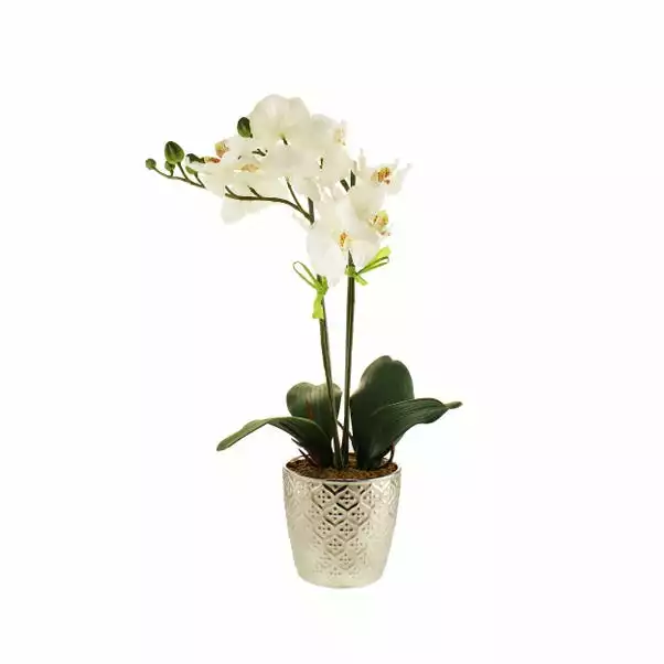 Elegantly presented, this stunning white orchid plant features delicate flowers designed with a beautiful detailing on a white colourway. Stylishly presented in a decorative silver pot, this artificial plant offers realistic finish.