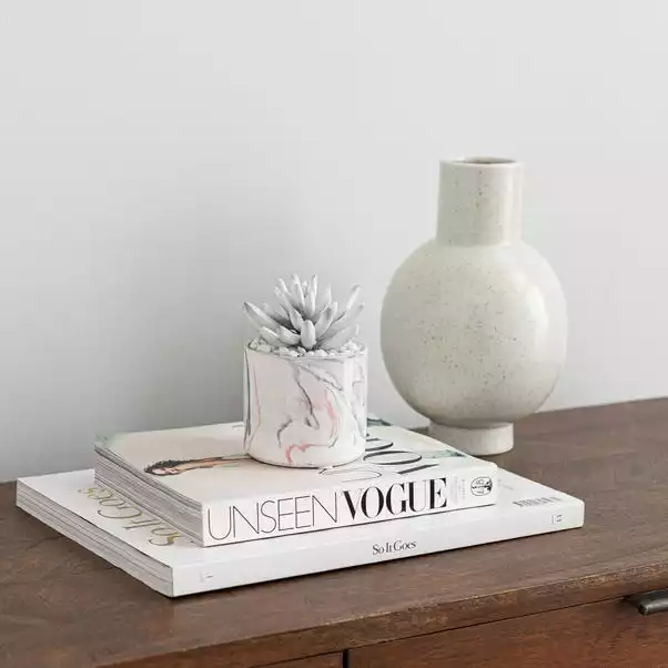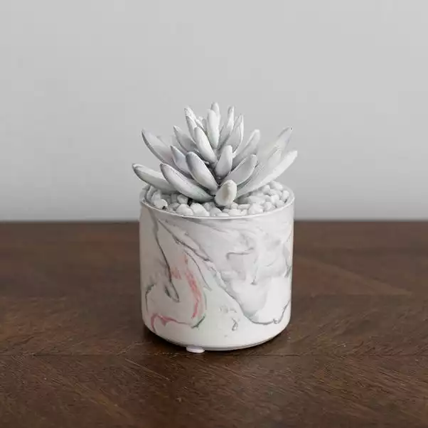 This lovely succulent in a marble-effect pot will bring the outside in, without the hassle! Ideal for displays on shelves, sideboards and tables, this succulent features a light grey colourway with hints of pink that will complement an array of decors beautifully.