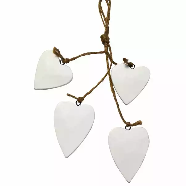 Our decorative hanging ornament is crafted with four white wooden hearts that are joined together by brown string.