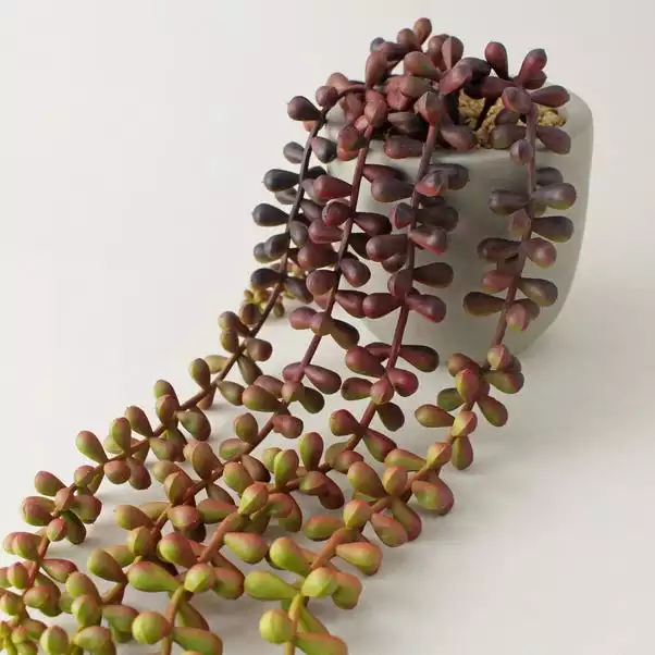 Made with an autumnal design and realistic finish, this beautiful string of pearls in grey cement pot is the ideal piece to display on high shelves and tables where the trailing elements can be fully displayed. Requiring little to no maintenance, this trailing plant features an intricate deep burgundy colourway which gradually lightens to an autumnal green.