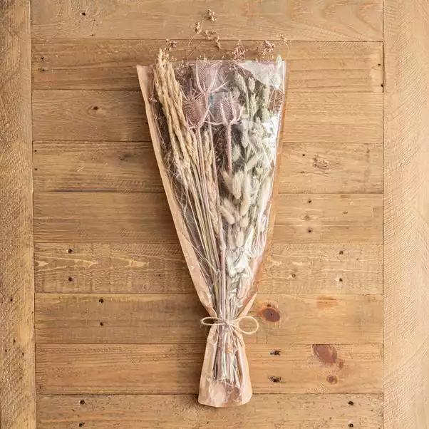 Pretty pastel colour tones complete this beautifully delicate mixed arrangement with thistles. Ideal for home displays, just place this dried natural flower bouquet in a vase or pot to bring your home to life.