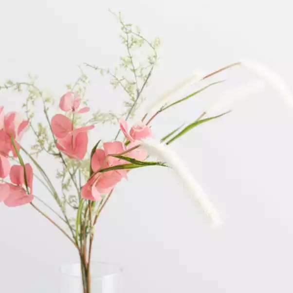 Stunning pink and green stems are featured in this bouquet of eucalyptus, foxtails and ferns. The bouquet is made from individual stems that can be arranged to preference, either by cutting it down to suit smaller vases, adding in real flowers or splitting across multiple vessels. The faux flowers are longer lasting than real flowers with no maintenance required. Conveniently packaged in a box specifically designed to fit through a letterbox, our letter box bouquet makes the perfect gift. Just confirm the delivery address has a standard sized letter box with 1m of space behind it to ensure a successful delivery.