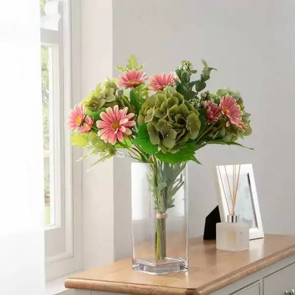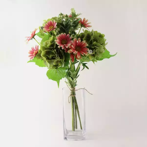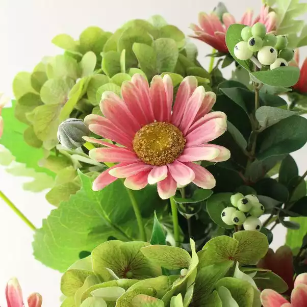 Our elegant realistic bouqets consit of Ball Hydrangeas, Daisies, Dusty Miller and Snowberry Spray flowers. These would be perfect to display in your home or as a gift.