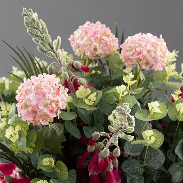 With its elegant design, this bouquet contains a stunning mix of realistic artificial flowers, including Foxgloves, Snowballs, Eucalyptus and Palm leaves. This stunning arrangement is perfect for a floral vase display to decorate your home, and would be ideal as a gift or as decoration for a special occasion