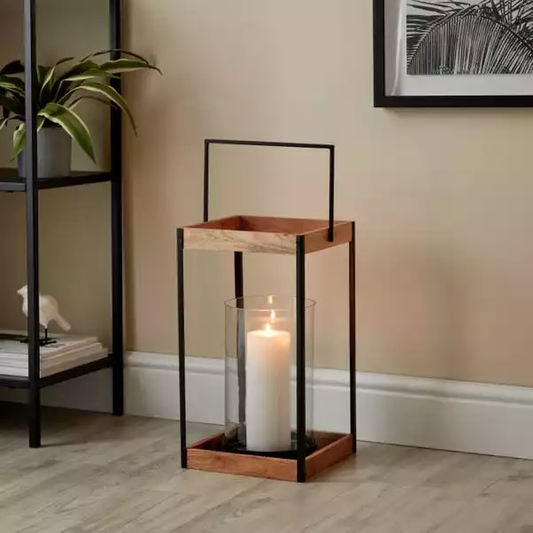 Create a gorgeous display of light and shadows with this beautiful Fulton lantern. This modern piece features a dark wood and black metal frame, with a glass candle holder and metal handle that is securely attached for easy transportation around your home. Complete this lantern with a LED candle pillar, perfect for creating a warm yellow flickering glow in your room.
