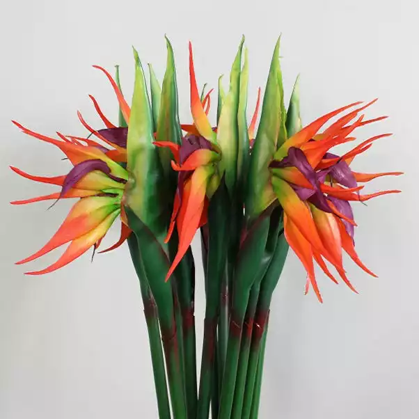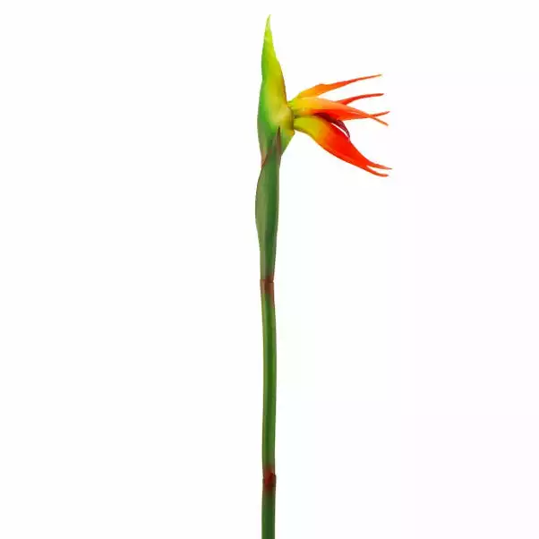 Eye-catching and stylish, this colourful bird of paradise stem has a unique tropical design and vibrant orange, yellow and green colourway. This low maintenance piece brings the outside in, without the hassle! This stem is ideal for vase display, either alone or as part of an arrangement.
