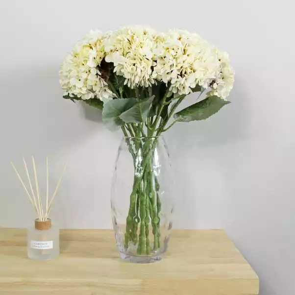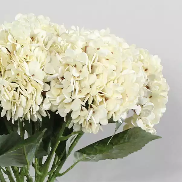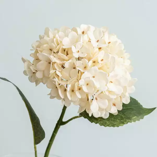 With a highly realistic finish, this beautiful cream hydrangea stem has delicate flower heads that feature intricately detailed petals. Ideal for vase display alone or as part of an arrangement, this low maintenance piece will bring the outside in, without the hassle!