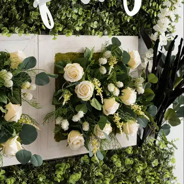 Ideal for wedding décor, this rustic white painted wooden frame with traditional florals features cream roses and dollar eucalyptus. Designed for easy display, using the hangers on the back, this piece can be matched with the range of co-ordinating traditional wedding florals.