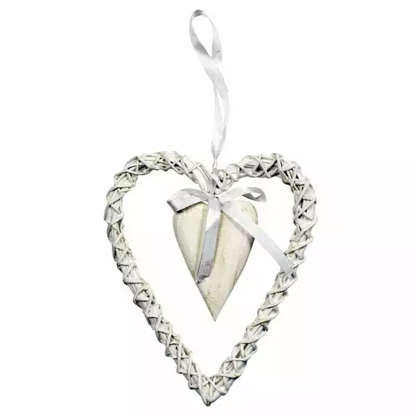 Our vintage white hanging heart decoration is crafted from a wicker outer heart and features an inner heart, which is finished with a satin bow.