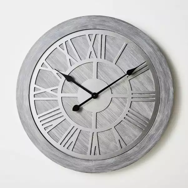 Bring a stunning centerpiece to your living space with this wooden clock. Featuring roman numeral figures and designed with a thick distressed grey border edge with classically styled hands, this circular shaped clock provides you with a practical timepiece and a graceful ornamental touch to your walls. The Grey Wooden Clock is elegant, chic and perfect for complementing your existing home décor.