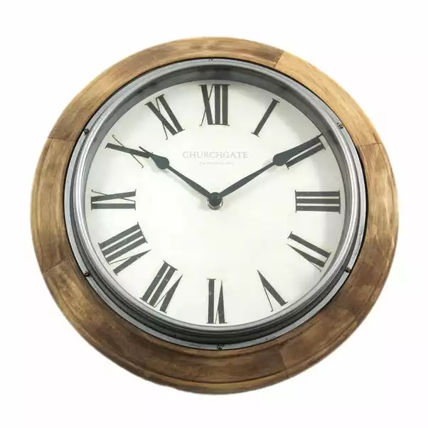 This wood-edged circular wall clock features chunky black Roman numerals set against a cream background.