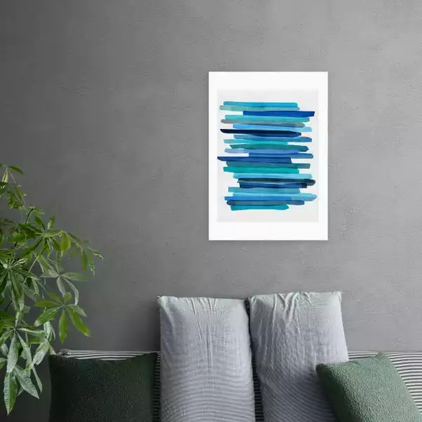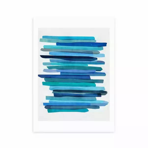 Cool tone blue lines cascade across this print, making it perfect for bringing a sense of tranquillity into a room.
