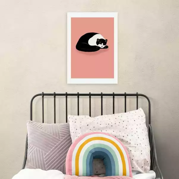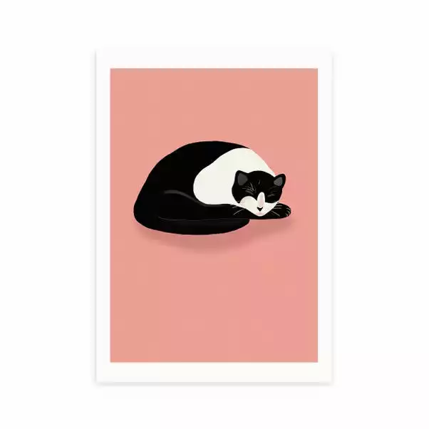 Cat lovers, this print is for you! An adorable sleeping cat sits on a bold pink backdrop, perfect for adding a splash of colour into your living room or bedroom.