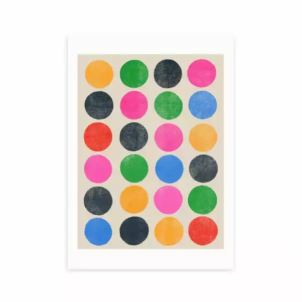 Bring a pop of colour to your living space with this bright, fun and simple print featuring repetitive circle shapes in vivid and uplifting colours. Made using a Giclee printing process to prevent fading, this wonderful print will stay vibrant for years to come. Each design is available in four print sizes and a variety of frame options, including unframed, so you can display your artwork however you wish.
