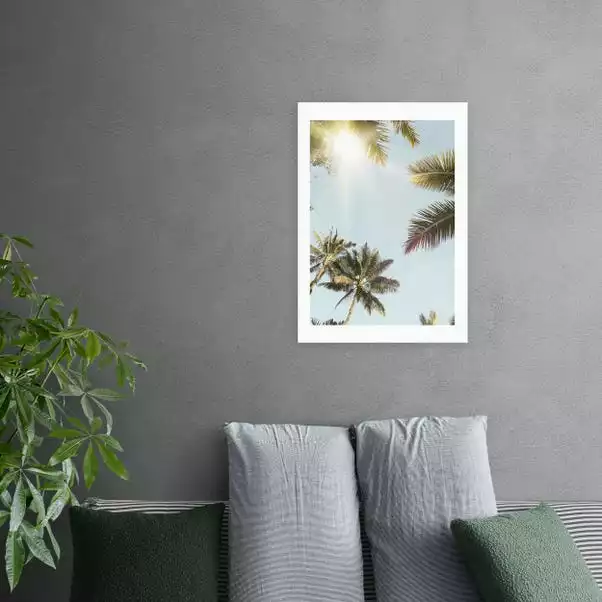 Transport yourself to paradise with palm trees and the holiday season with the glowing sun and dazzling blue skies. Made using a Giclee printing process to prevent fading, this print will stay vibrant for years to come and Each design is available in four print sizes and a variety of frame options, including unframed, so you can display your artwork however you wish.