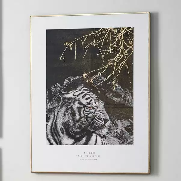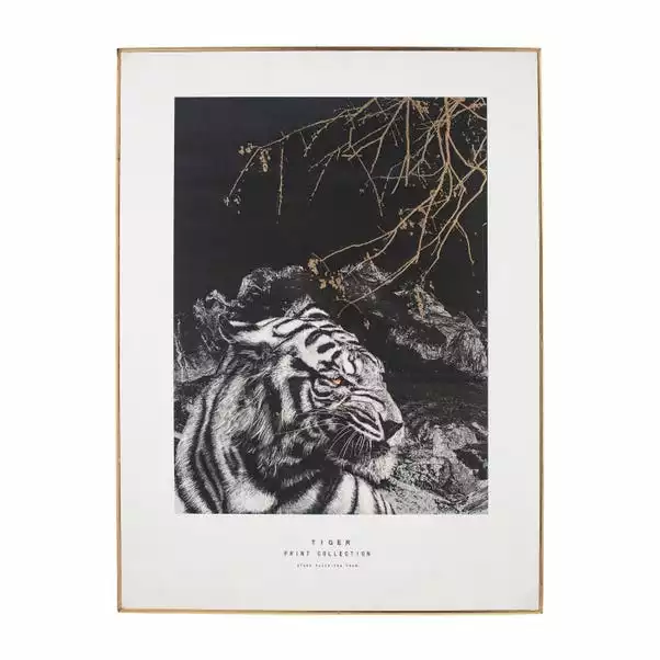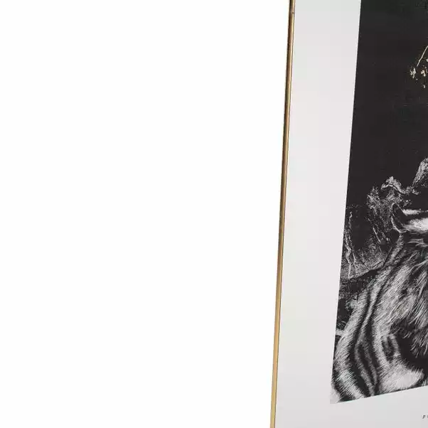 Transform your interior wall décor with this magnificent print displaying an intensely detailed monochrome image of a fierce tiger with accents of gold detailing to accentuate the texture and depth. Along with the gold detailing, the gold wooden frame emphasizes the premium appeal, so whether you want to discretely add some subtle décor or show off this superb look, this print will enhance your space.