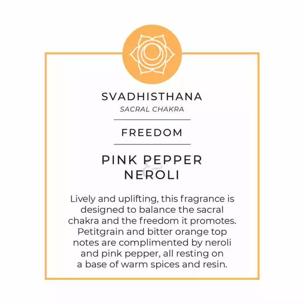 Place this sweet and uplifting ceramic candle in your home for a sense of equilibrium as the selected fragrances focus on the freedom and awakening formed within the sacral chakra. Within this scent, you can find pink pepper and neroli complementing petigran and bitter orange top notes, while the citrus elements gently rest upon a base of warm spices and resin. With a 72 hour burn time, this wonderful candle is long lasting and looks delightful to add to your home décor with vibrant orange accents and presented in a matching gift box. Also available as a reed diffuser and diffuser refill bottle for a complete gifting collection.